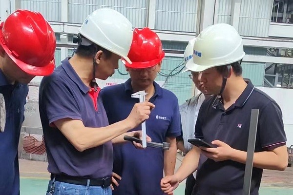 鍛造成型后,待鍛件冷卻,使用測(cè)量工具依照?qǐng)D紙對(duì)成品鍛件尺寸進(jìn)行最后檢驗(yàn)。在客戶(hù)長(zhǎng)達(dá)一個(gè)多小時(shí)的檢驗(yàn)中,對(duì)每個(gè)鍛件都進(jìn)行了嚴(yán)格細(xì)致的測(cè)量。最終,每個(gè)鍛件都符合設(shè)計(jì)要求,宣告本次試模取得圓滿(mǎn)成功,沖床可以下線(xiàn)實(shí)裝,進(jìn)行鍛造生產(chǎn)!
