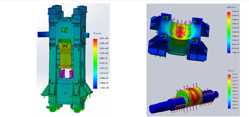 威榮精鍛的產(chǎn)品,以清華大學(xué)教材《曲柄壓力機(jī)》和《熱模鍛壓力機(jī)》為設(shè)計(jì)參考,吸取國(guó)內(nèi)外優(yōu)秀機(jī)型的優(yōu)點(diǎn)進(jìn)行設(shè)計(jì);在設(shè)計(jì)完成后,通過(guò)計(jì)算機(jī)有限元分析,模擬出各個(gè)關(guān)鍵點(diǎn)的位移變量,皆?xún)?yōu)于同類(lèi)型機(jī)型,整體剛性更是高于標(biāo)準(zhǔn)近3倍。在制造完成之后,還要通過(guò)噸位達(dá)標(biāo)測(cè)試和剛性檢驗(yàn)才可出廠驗(yàn)收,保證能力足夠大,機(jī)身足夠硬。