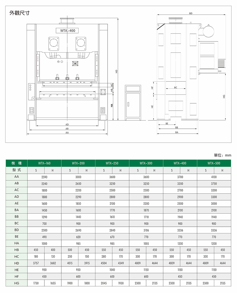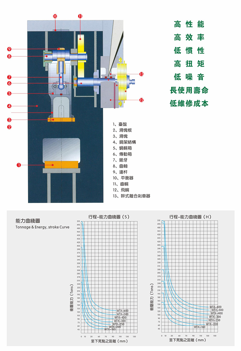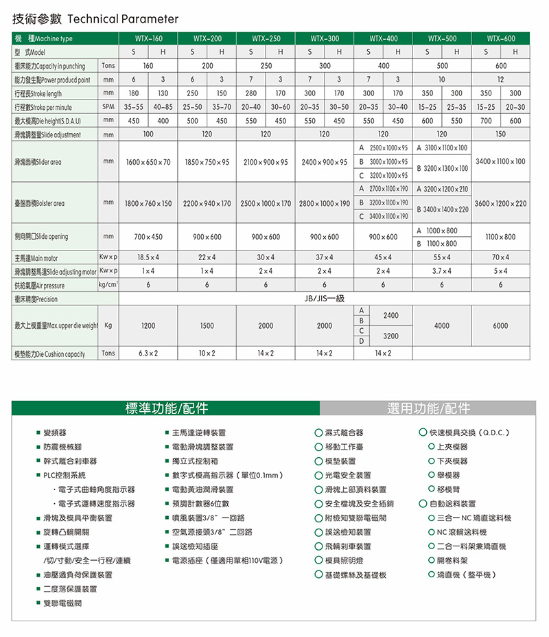 WTX系列沖床機(jī)身具有極高之剛性、良好之精度及較大之床面,可適用連續(xù)加工順?biāo)椭铝?、沖孔、成形、引伸等加工,并可選擇性加裝移動(dòng)臺(tái)車,以達(dá)快速換模之目的。此種機(jī)型特別適用于汽車、摩托車、五金、家電等制品之沖壓加工。