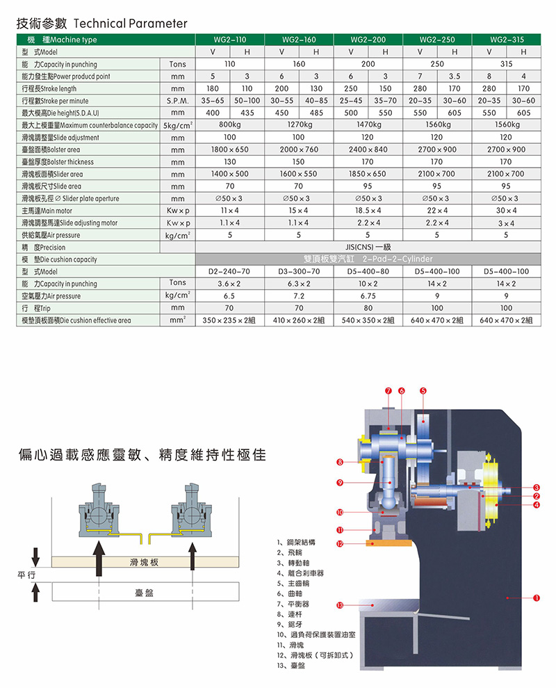 WG2(系列開式雙曲軸精密鋼架沖床)--適用于長而寬鈑金物料之剪裁、沖孔、彎曲等多用途加工,如馬達外殼、汽車零件、家用產(chǎn)品、電腦主機外殼、錄音機及音樂底盤、電源供應器底盤等。其寬敞的臺盤和開口不僅有利于單工程或多工程模式的作業(yè),對于二次元、三次元的自動移送裝置或配有伺服傳動的機械手亦能輕易配合,從而達成多用途的自動送料。